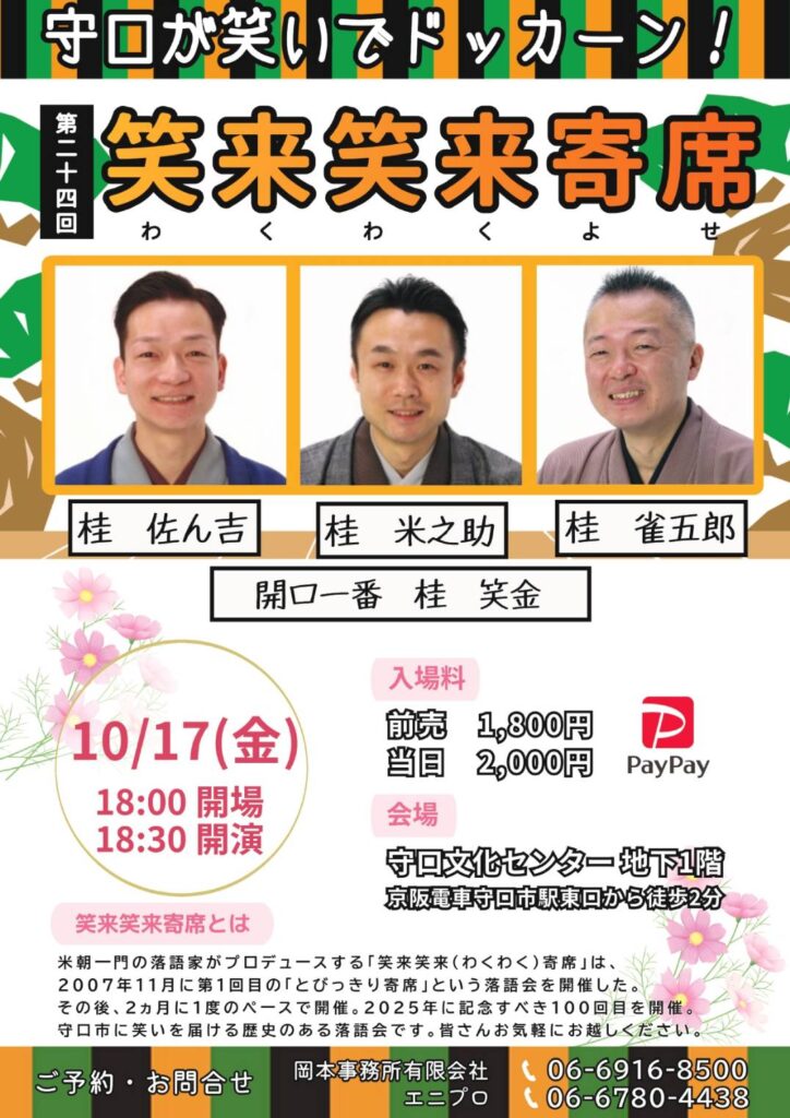 クリックで拡大 《大阪》 笑来笑来寄席 日 時 2025年10月17日 (金) 開演:18:30 (開場:18:00) 会 場 守口文化センター地下1階 料 金 予約:1,800円 (当日:2,000円) 出 演 桂米之助 桂雀五郎 桂佐ん吉 桂笑金 お問合せ エニプロ 0669168500 前の公演名古屋中電ホール 三人同時襲名披露公演 次の公演京都府立文化芸術会館 三人同時襲名披露公演 ホーム / 出演情報 / 落語 / 笑来笑来寄席