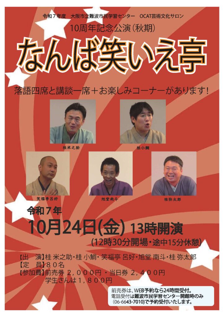 クリックで拡大 《大阪》 なんば笑いえ亭 日 時 2025年10月24日 (金) 開演:13:00 (開場:12:30) 会 場 大阪市立難波市民学習センター 料 金 予約:2,000円 (当日:2,400円) 出 演 米之助 小鯛 呂好 南斗 弥太郎 お問合せ 大阪市立難波市民学習センター0666437010 前の公演京都府立文化芸術会館 三人同時襲名披露公演 次の公演ちょうば改め四代目桂米之助独演会 ホーム / 出演情報 / 落語 / なんば笑いえ亭