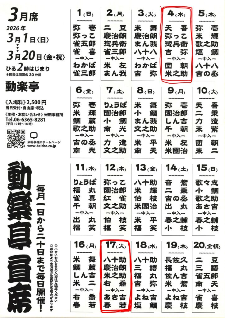 《大阪》 動楽亭昼席3月4日トリ出番
