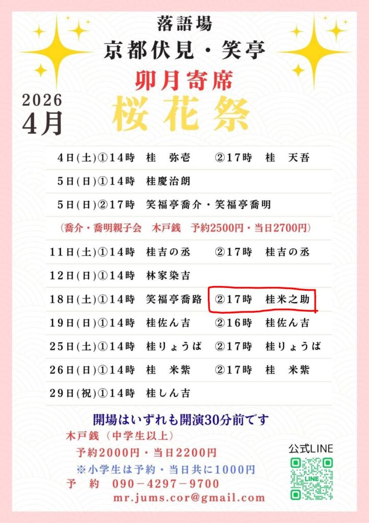 クリックで拡大 《京都》 笑亭4月 日 時 2026年4月18日 (土) 開演:17:00 (開場:16:30) 会 場 京都伏見笑亭 料 金 予約:2,000円 (当日:2,200円) 出 演 米之助 お問合せ 09042979700 前の公演笑亭3月 次の公演第27回笑来笑来寄席 ホーム / 出演情報 / 落語 / 笑亭4月